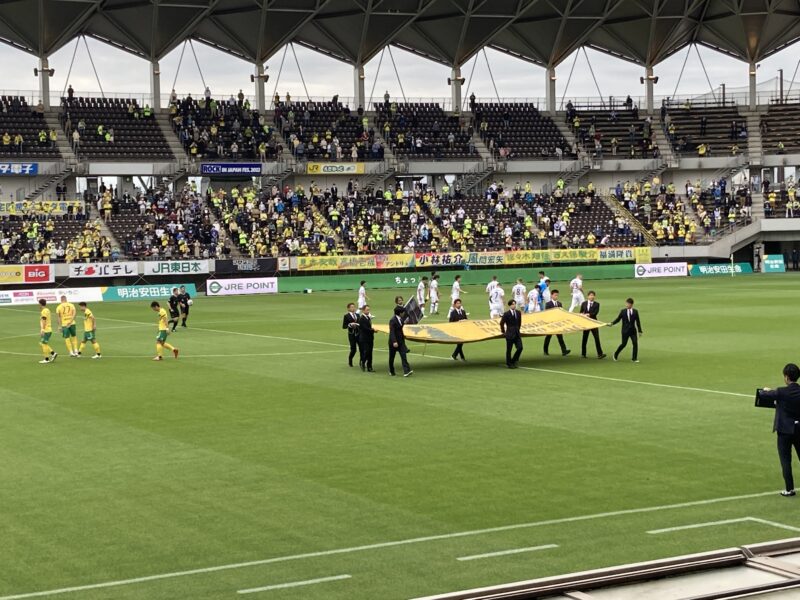 こちらは、オシム氏が逝去された後の岡山戦でのセレモニー。このとき間近でこのフラッグを目にして、色褪せやほつれがずいぶんあることを知った。それだけ長い間、オシム氏はジェフの精神的支柱であったことを実感。それは、これからも。