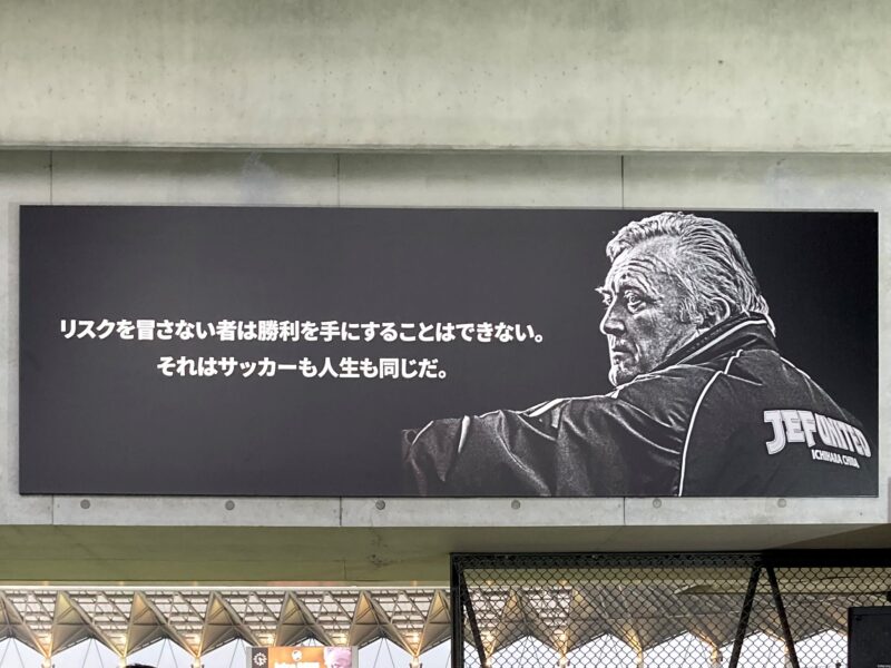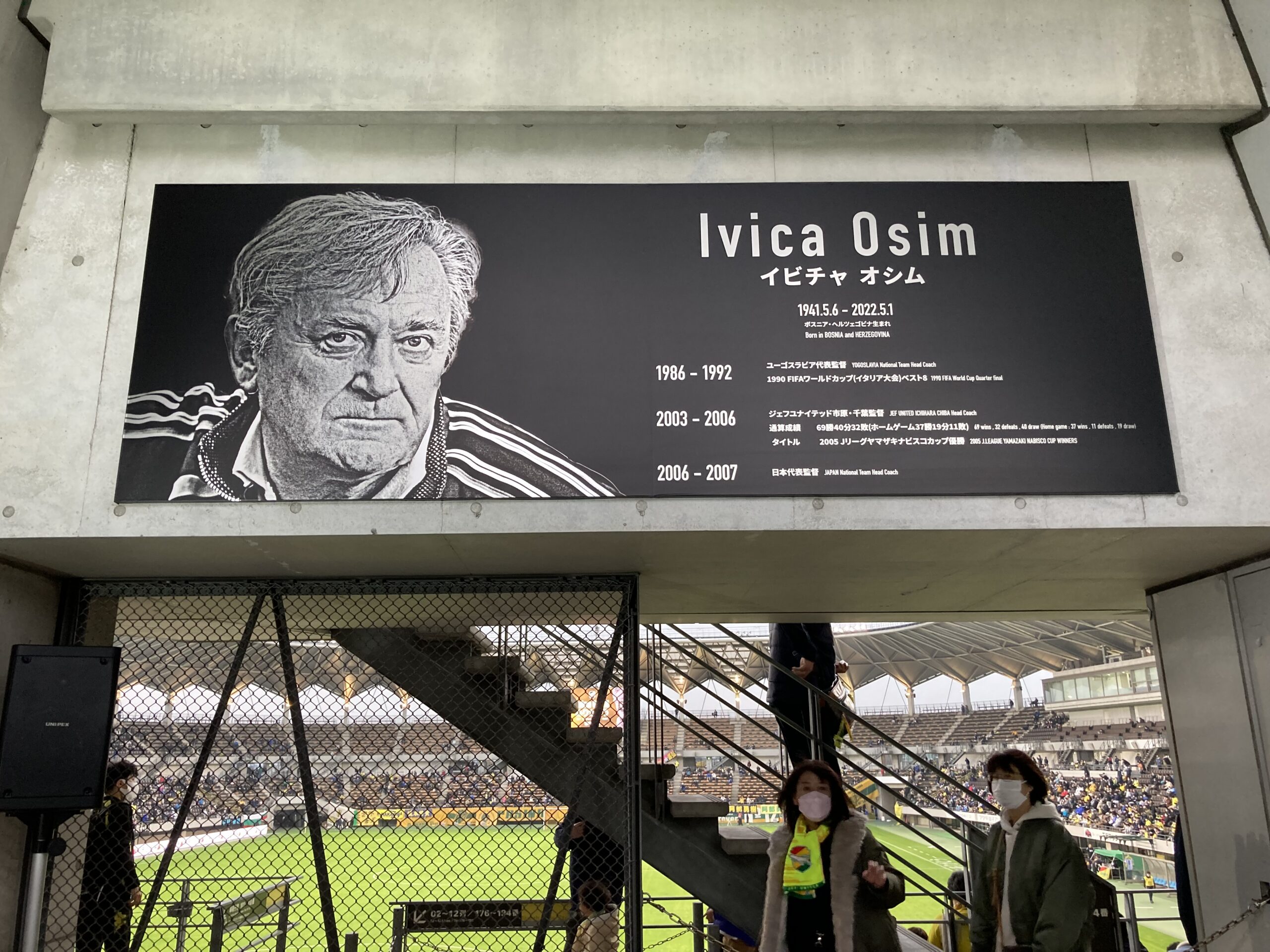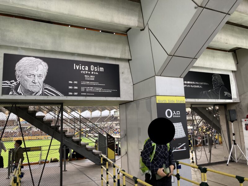 フクアリのホーム側北側コンコースに設置されたオシムゲート。サポーターの発案にクラブと行政が応える形で実現。この2枚のパネルの手前(撮影者側)には「Osim Gate オシムゲート」と銘が打たれた案内表示も。