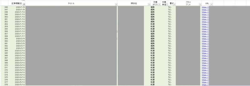 記事が実際に媒体に掲載された日、記事の原稿を提出した日、どちらで管理しても良いと思いますが、混在させるのは良くないので注意しましょう。月ごとの作業内容の管理に使うことを考えたら、原稿を提出した日の方が便利です。年度ごとの分析をしたい時の利便性を考えると、年度だけの欄を設けておくのも有効。